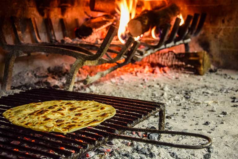 Comunque, che Frontone sia il feudo della crescia è cosa risaputa. Attira oltre 20mila golosi ogni anno nei due locali storici nel borgo medievale del Castello. “È solo farina, uova, strutto e sale” precisa la cuoca Catia della “Taverna della Rocca”. “Il segreto è nella cottura – aggiungono Fausto e Marta del “Ristorante Amabile – “Niente testo, teglia, padella. Si cuoce sulla graticola, a pochi centimetri dalle braci e la legna proviene dal Monte Catria donandole quel profumo che la contraddistingue.” Tempi di attesa ridotti al minimo, si porta ovunque ed è farcita di salsiccia, salumi, formaggi, erbe di campo.