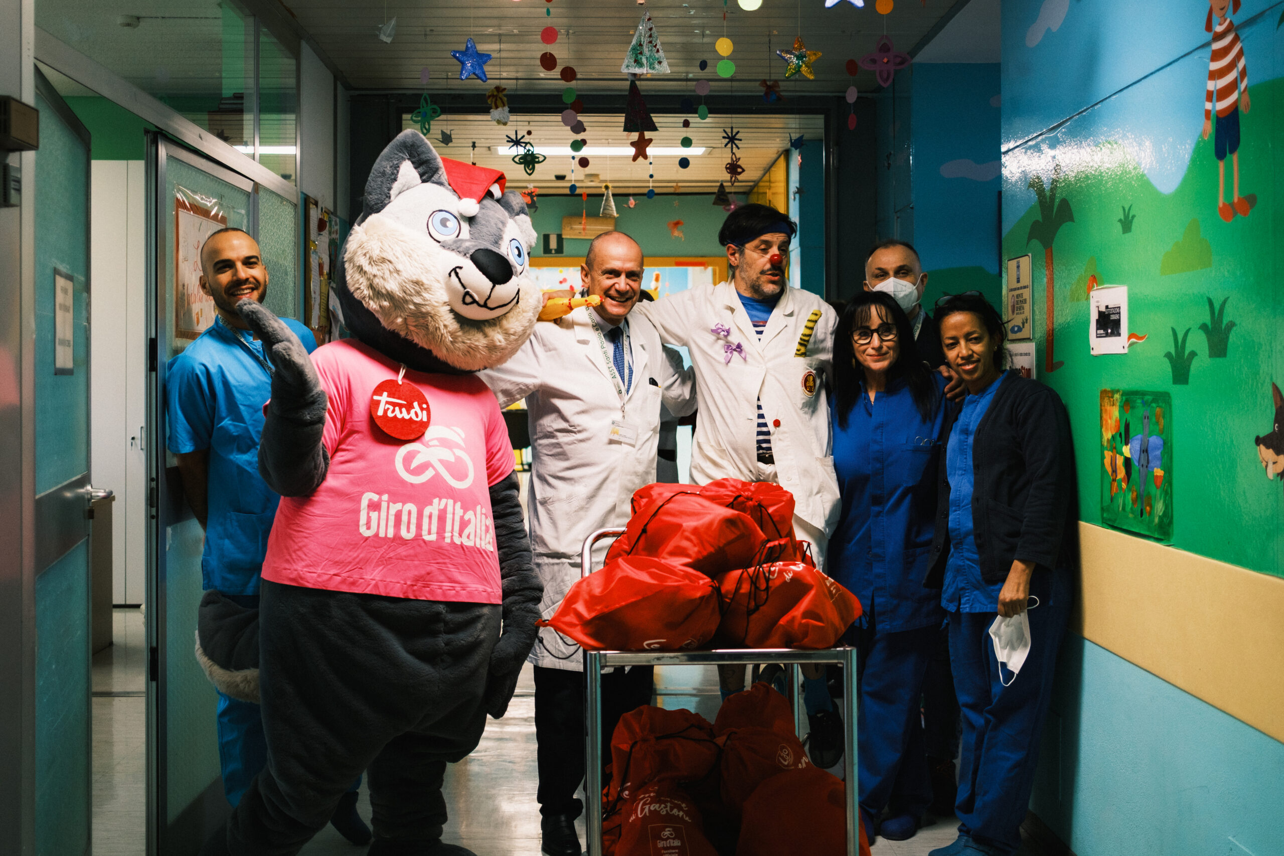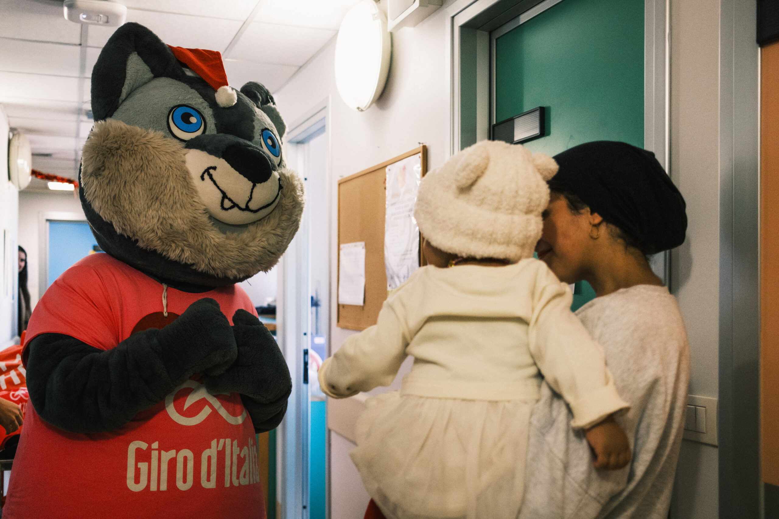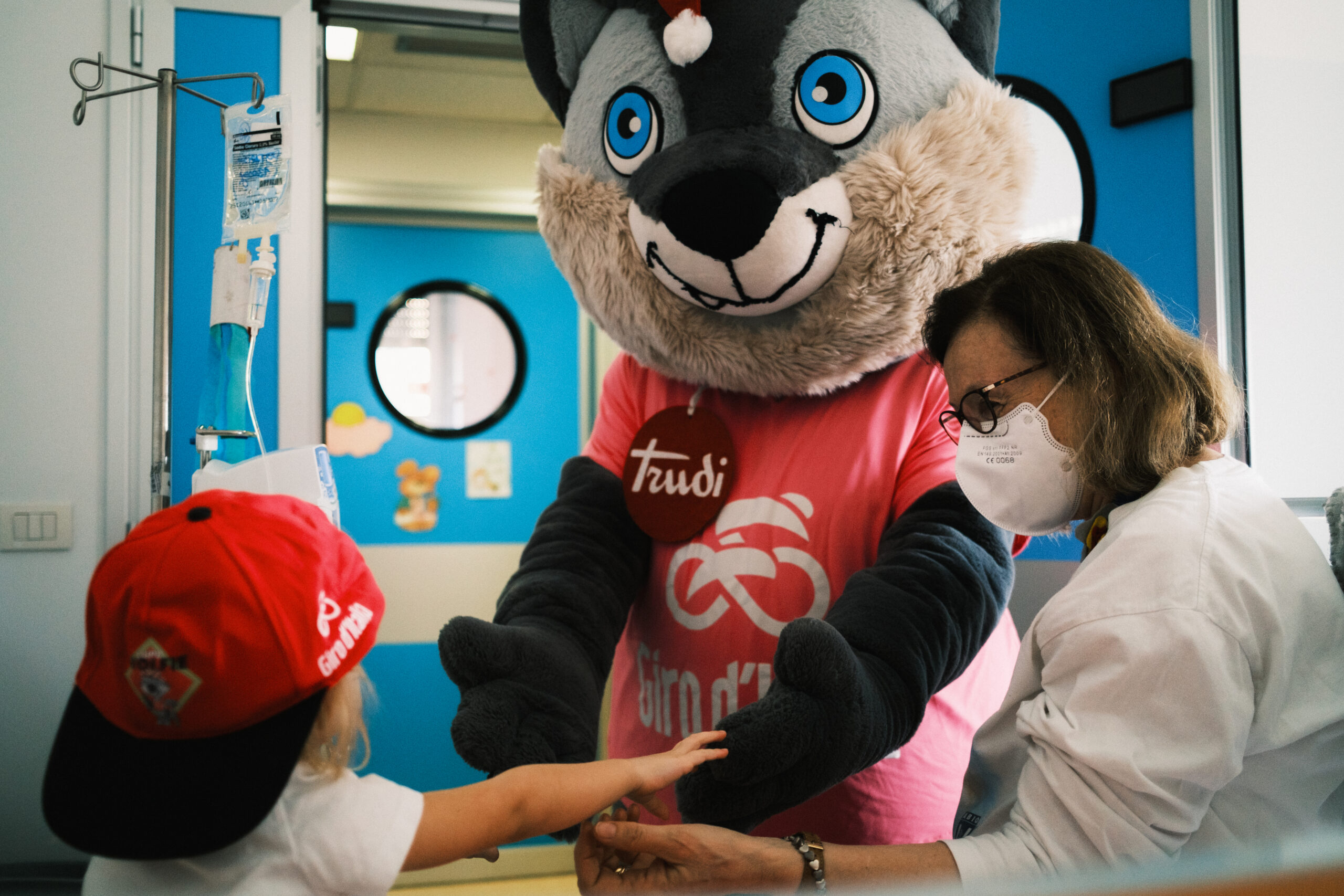 Together with their mascot Wolfie – created years ago in partnership with WWF Italy to promote awareness of wolf conservation – the Giro d’Italia and the Giro d’Italia Women visited children undergoing treatment at San Paolo Hospital and at the De Marchi Paediatric Clinic of the Policlinico of Milan, offering moments of joy, play and light-heartedness.