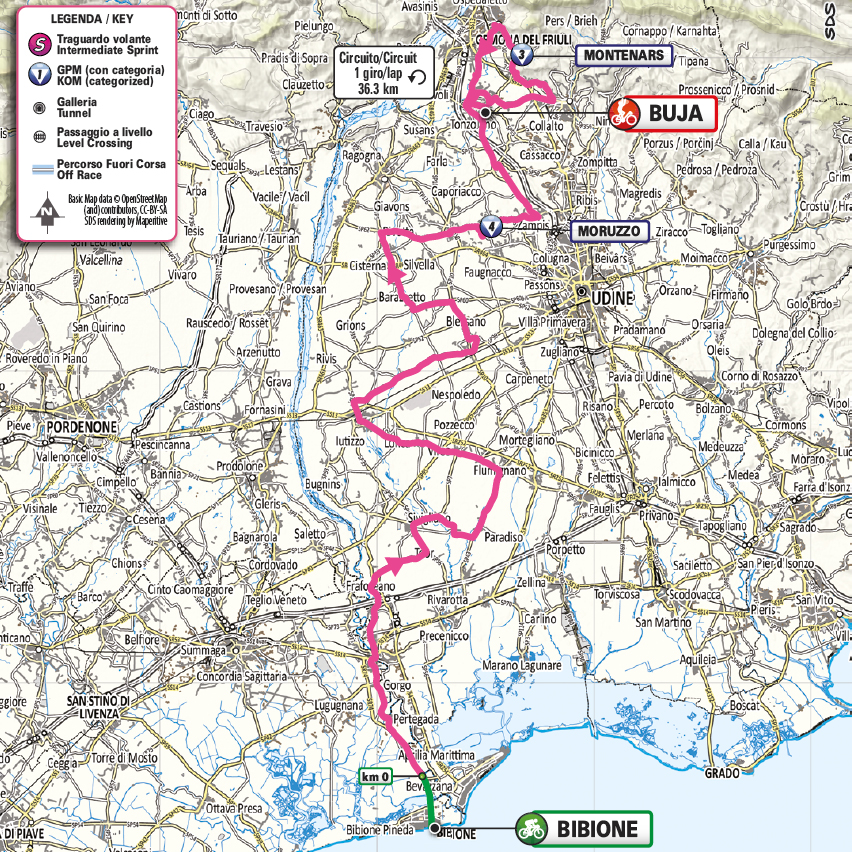 Almost entirely flat, with just one intermediate climb that won’t prevent a mass sprint. Start from Roncade H-Farm, head north along the Piave River, tackle the Muro di Ca’ del Poggio, then descend along the Livenza toward the finish in Caorle.